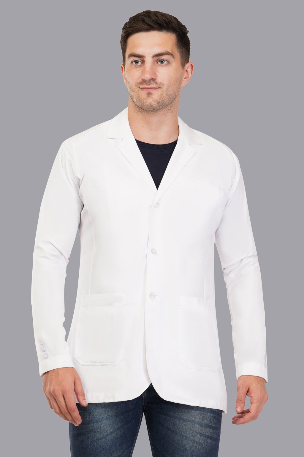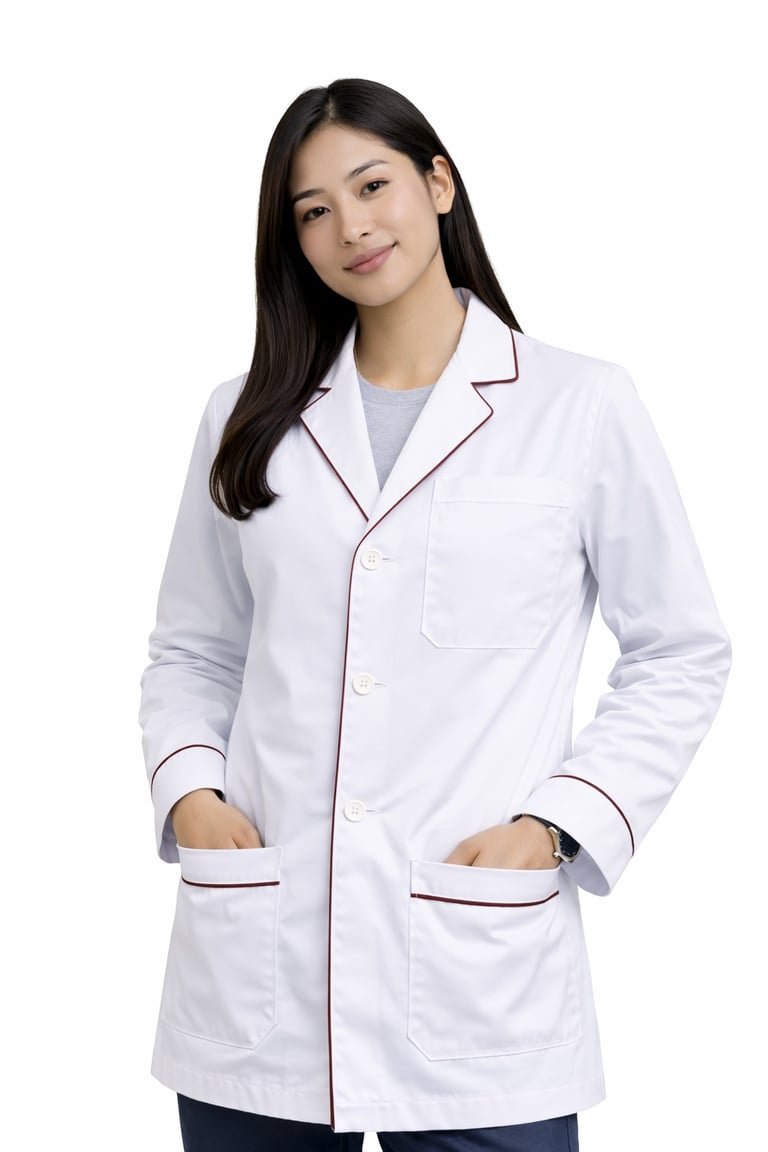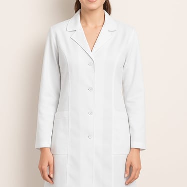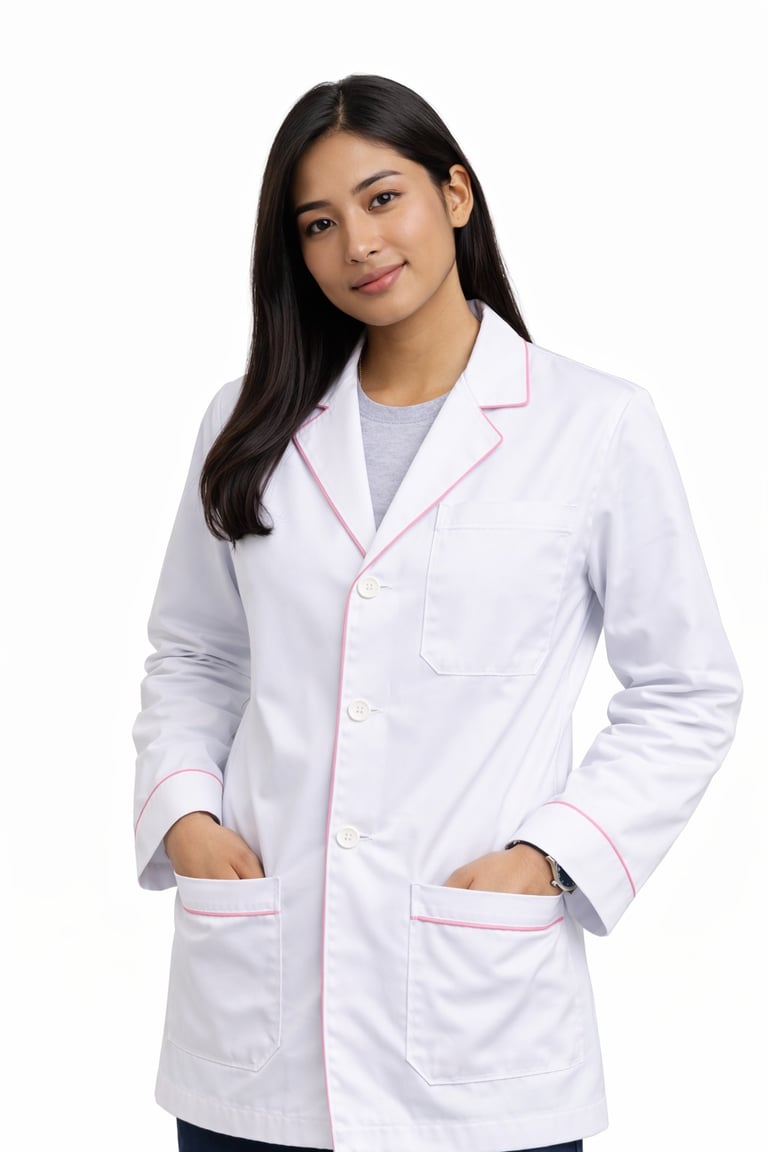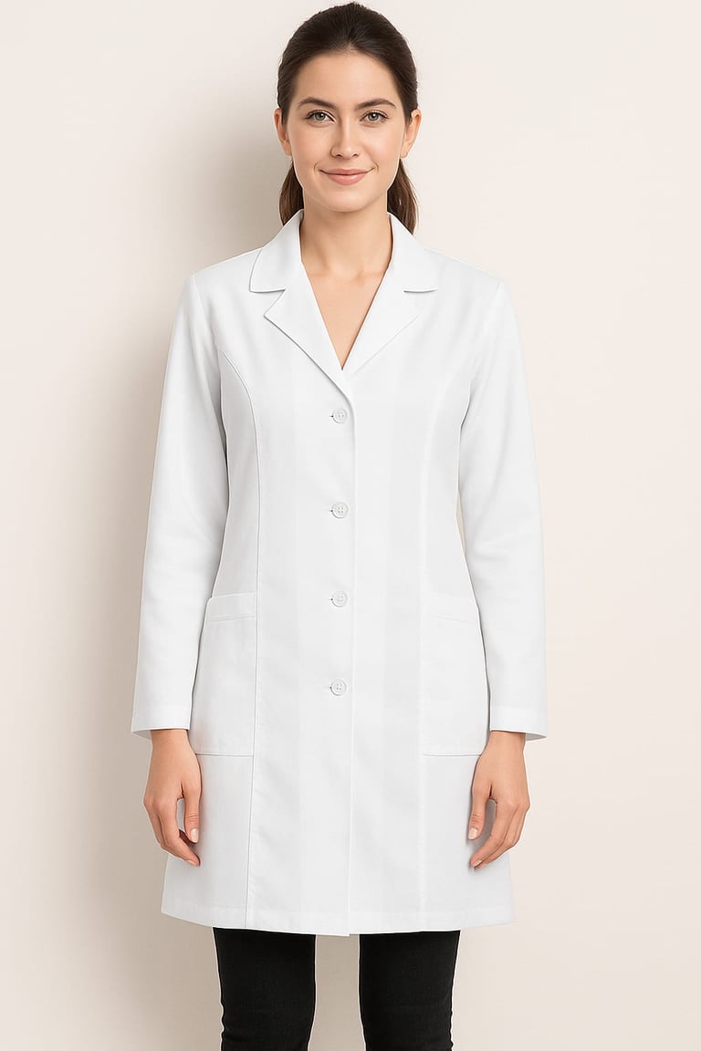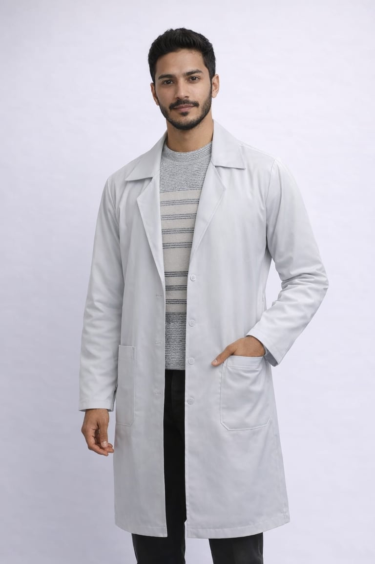 A doctor apron, commonly known as a lab coat, is a professional garment made from durable, breathable fabric, designed to provide protection against spills and contaminants during medical procedures. It features a crisp white design, full sleeves, and practical pockets for carrying essential tools.