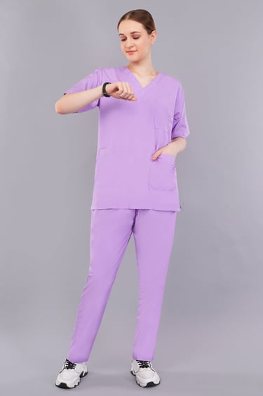 "Shop the doctor lilac scrub set with half sleeves, offering a comfortable and stylish fit for both men and women. Ideal for medical professionals, combining functionality and a professional look."