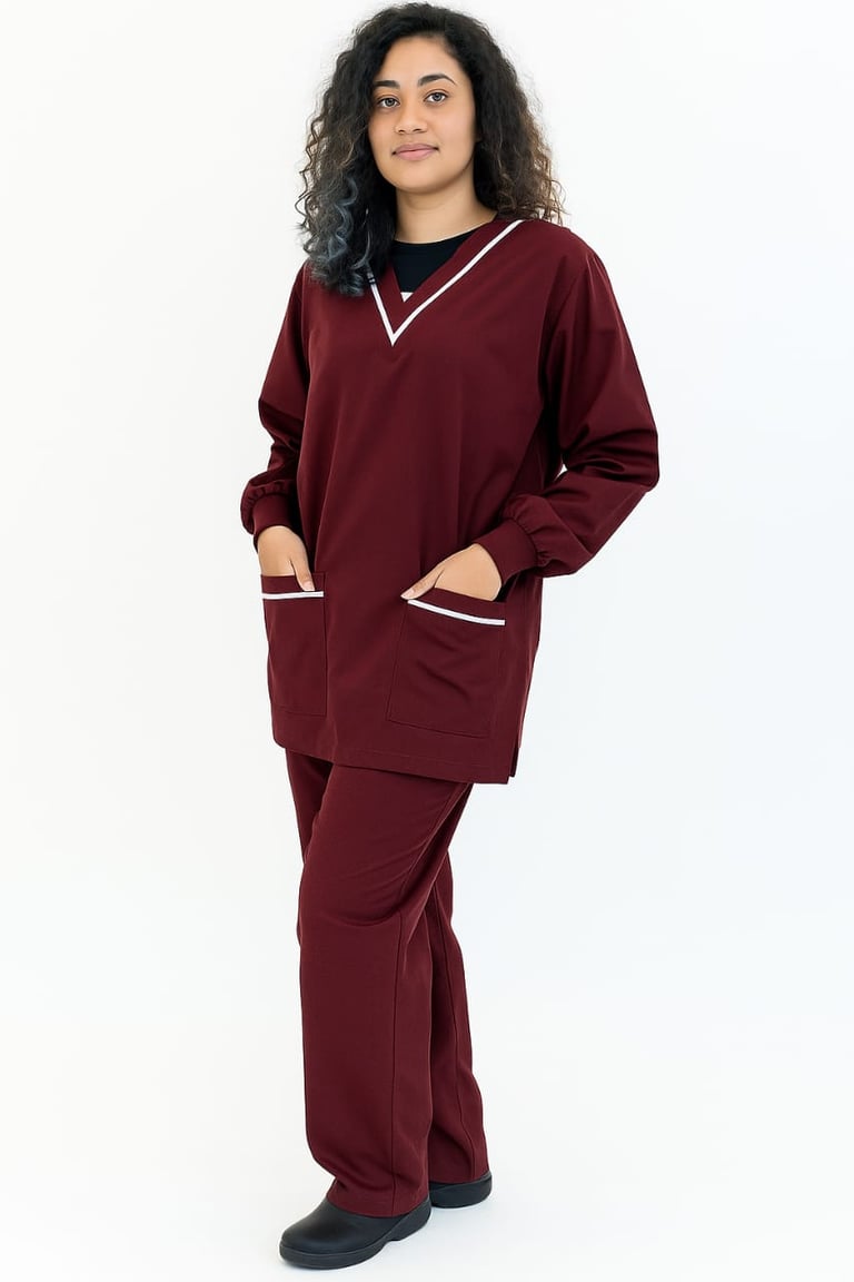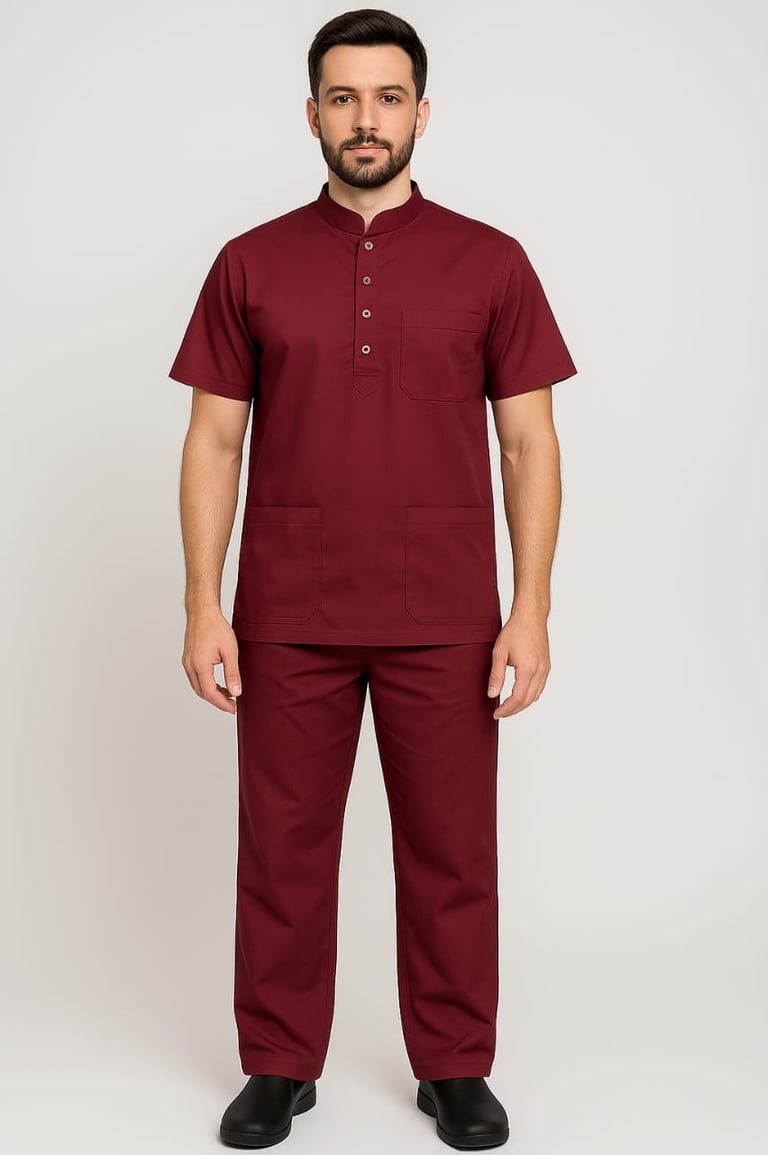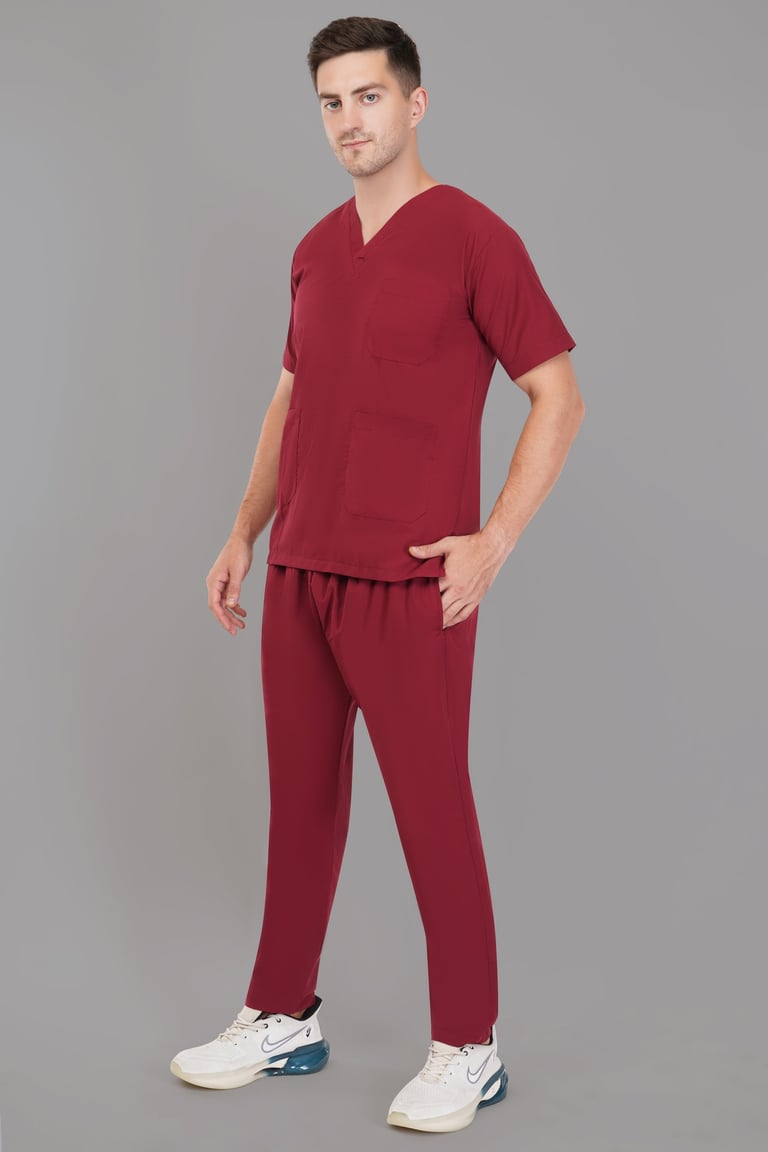 "Shop the doctor Maroon scrub set with full Rib Sleeves, offering a comfortable and stylish fit for both men and women. Ideal for medical professionals, combining functionality and a professional look."