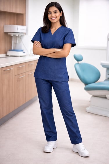 "Shop the stylish Denim scrub with Half sleeves, designed for women. Perfect for medical professionals seeking durability and a professional look."