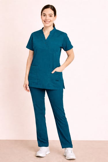 "Shop the stylish teel blue scrub with Half sleeves, designed for women. Perfect for medical professionals seeking durability and a professional look."