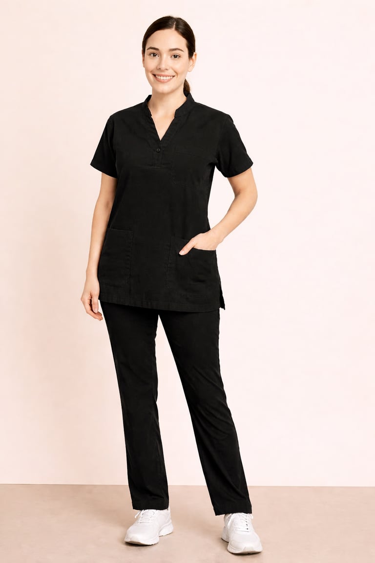"Discover the versatile black scrub with half sleeves, designed for women. Crafted for comfort, durability, and a professional appearance in healthcare settings."