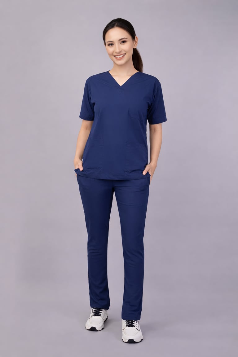 "Shop the Navy Blue scrub with half sleeves, offering a comfortable and stylish fit for women. Ideal for medical professionals, combining functionality and a professional look."