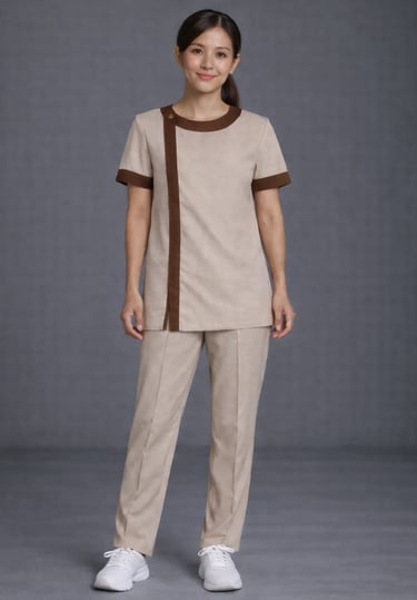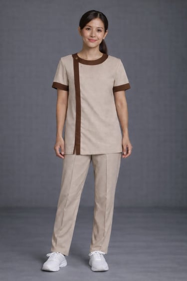 Women’s Housekeeping Uniform Set – Beige Tunic with Brown Contrast & Straight Pants