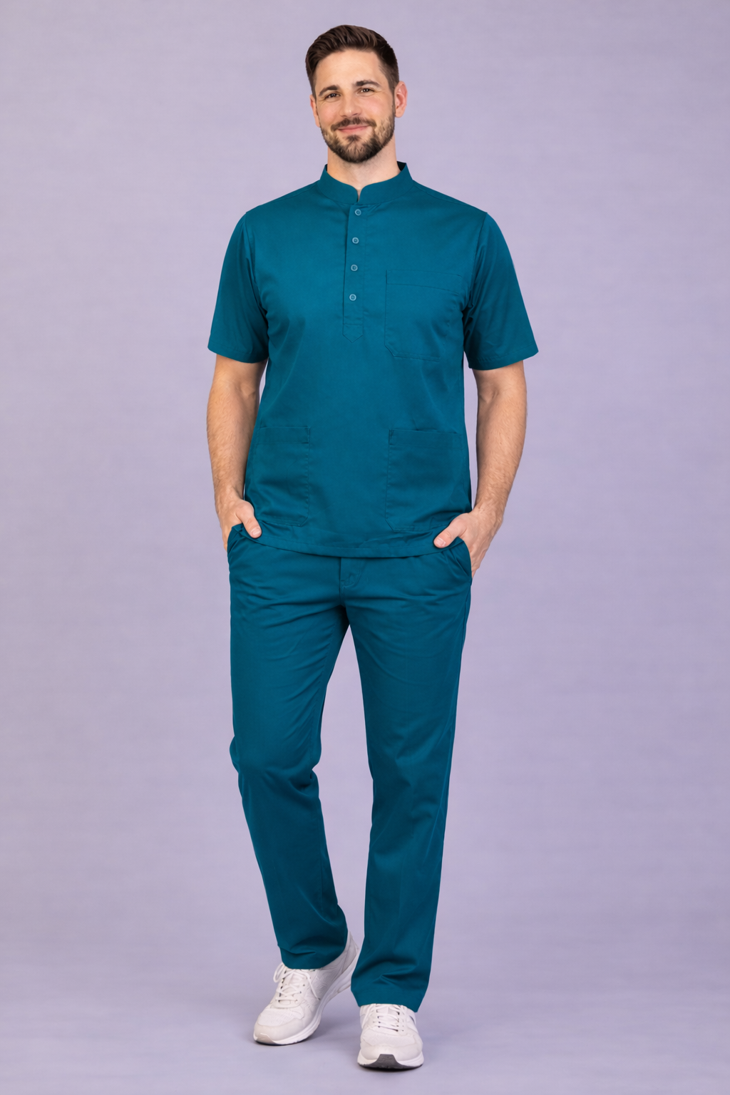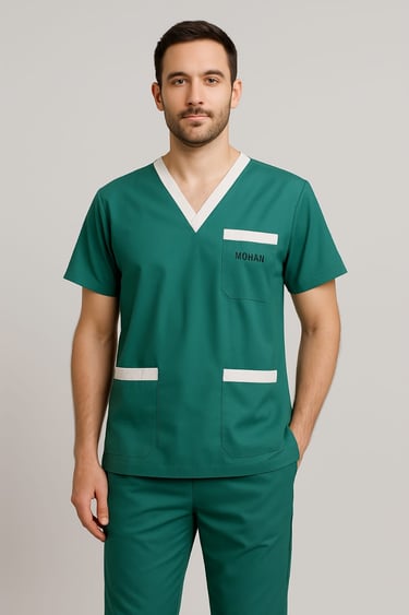 "Discover the versatile bottle green scrub with half sleeves, designed for men. Crafted for comfort, durability, and a professional appearance in healthcare settings."