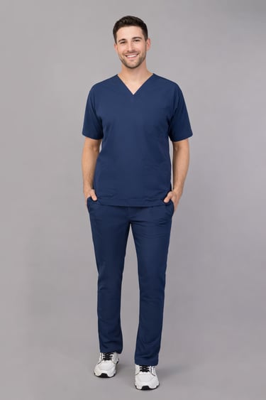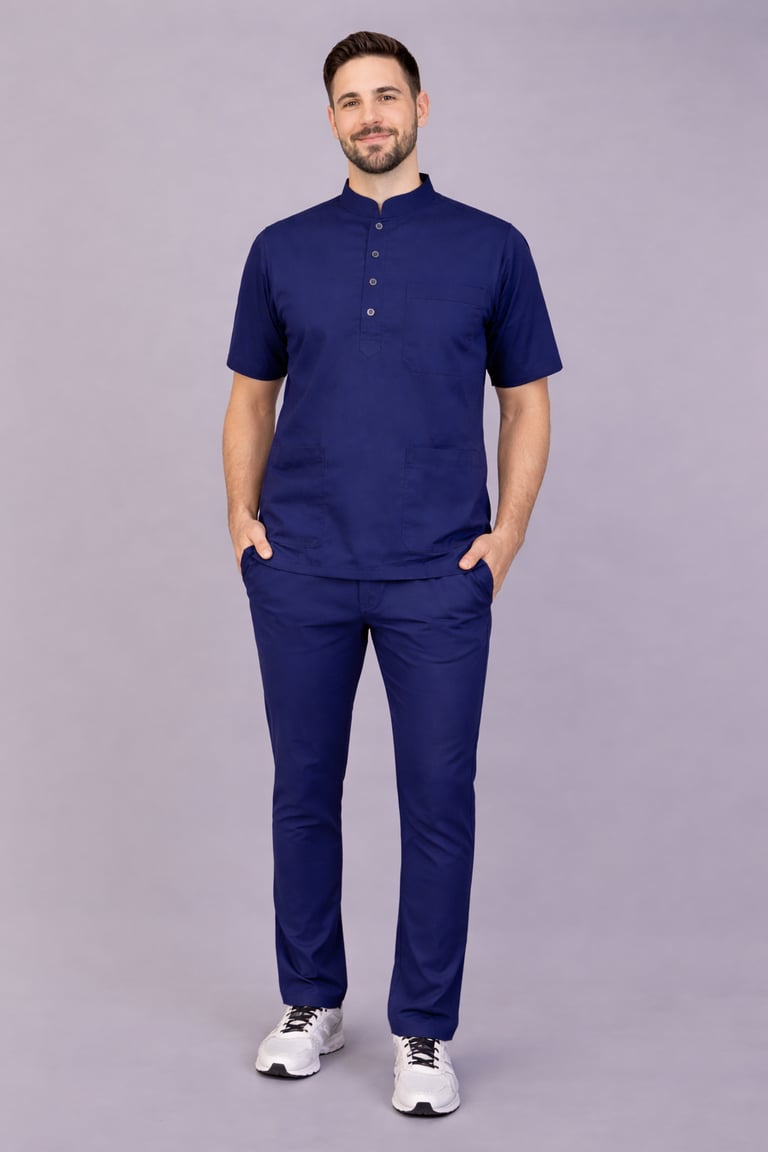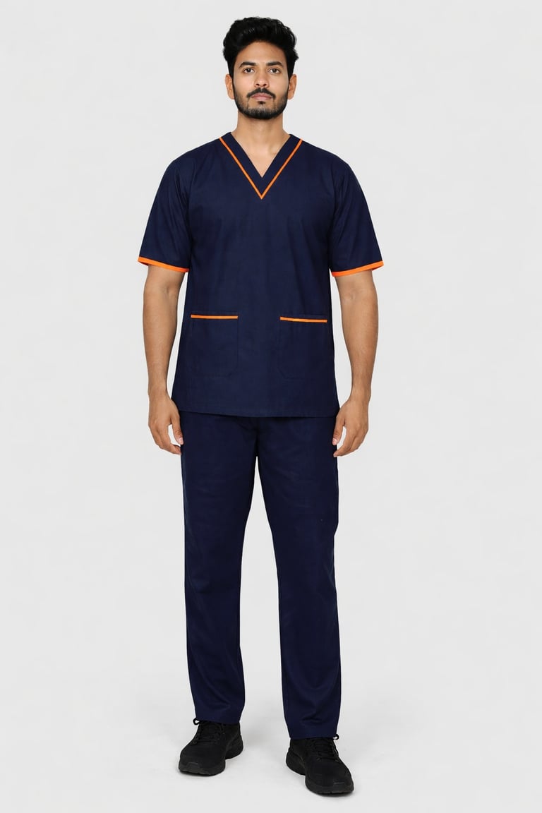 "Discover the versatile navy blue scrub with half sleeves, designed for men. Crafted for comfort, durability, and a professional appearance in healthcare settings."