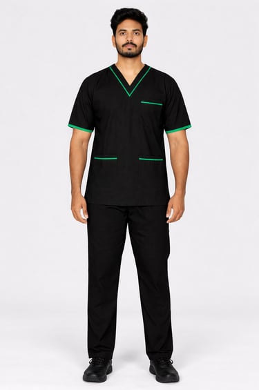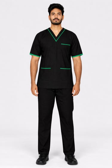 "Shop the stylish medical black scrub set with Half sleeves, designed for men. Perfect for medical professionals seeking durability and a professional look."