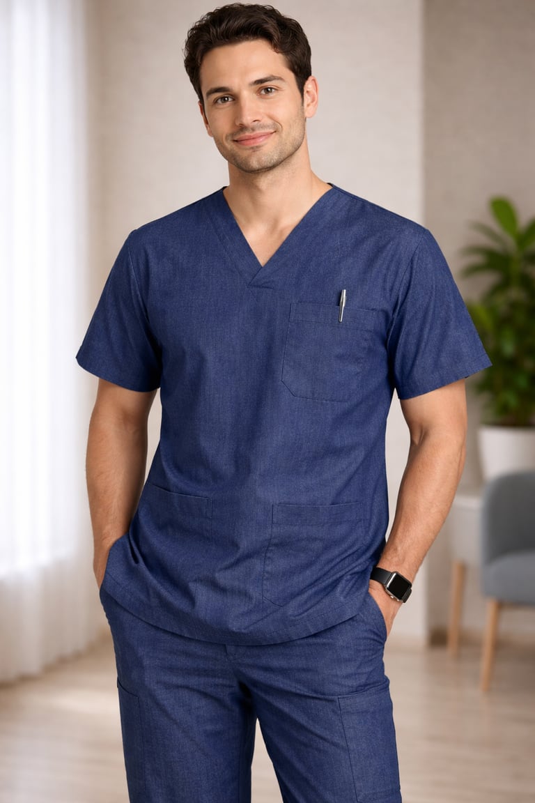 "Shop the stylish medical Denim scrub set with Half sleeves, designed for men. Perfect for medical professionals seeking durability and a professional look."