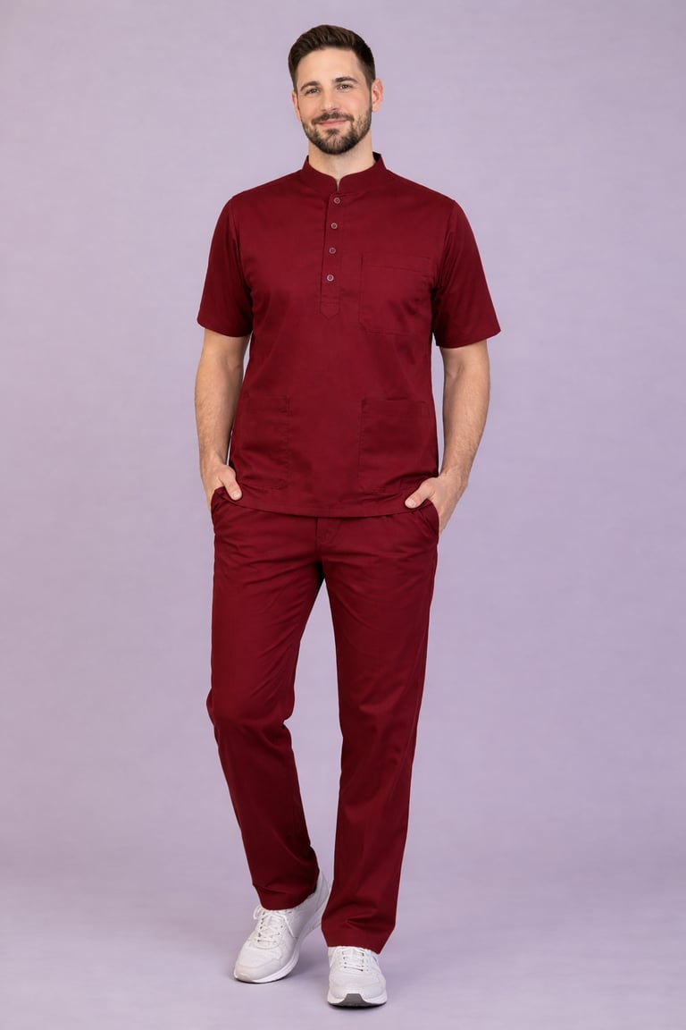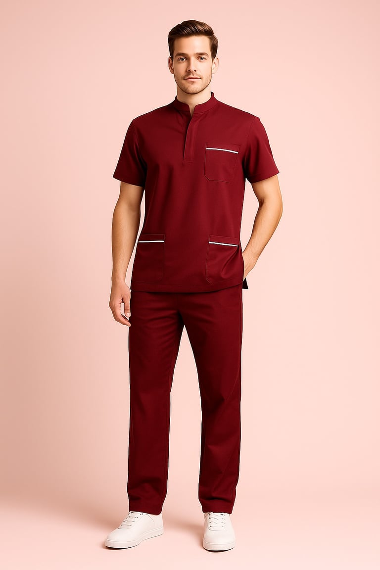 "Shop the stylish medical Maroon scrub set with Half sleeves, designed for men. Perfect for medical professionals seeking durability and a professional look."